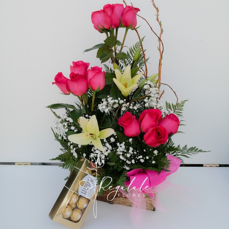 Bello arbolito de 12 rosas rosas, 2 varas de lirio y caja de ferrero de 100 gramos