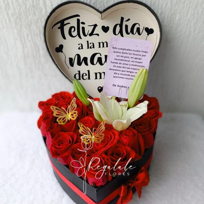 Caja corazón negra compuesta por 24 rosas rojas y lirio blanco.